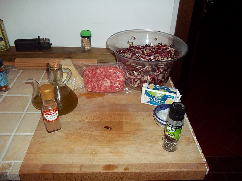 Dopo avere preparato gli ingredienti base componiamo il nostro pasticcio nel seguente modo:distribuire sul fondo un po' di besciamella. Alternate poi gli strati di lasagne (asciugate con un canovaccio) con il sugo di radicchio e salsiccia e besciamella avendo cura di aggiungere sullo strato di besciamella del formaggio grana grattugiato.Terminate con uno strato lasagne, besciamella e grana.